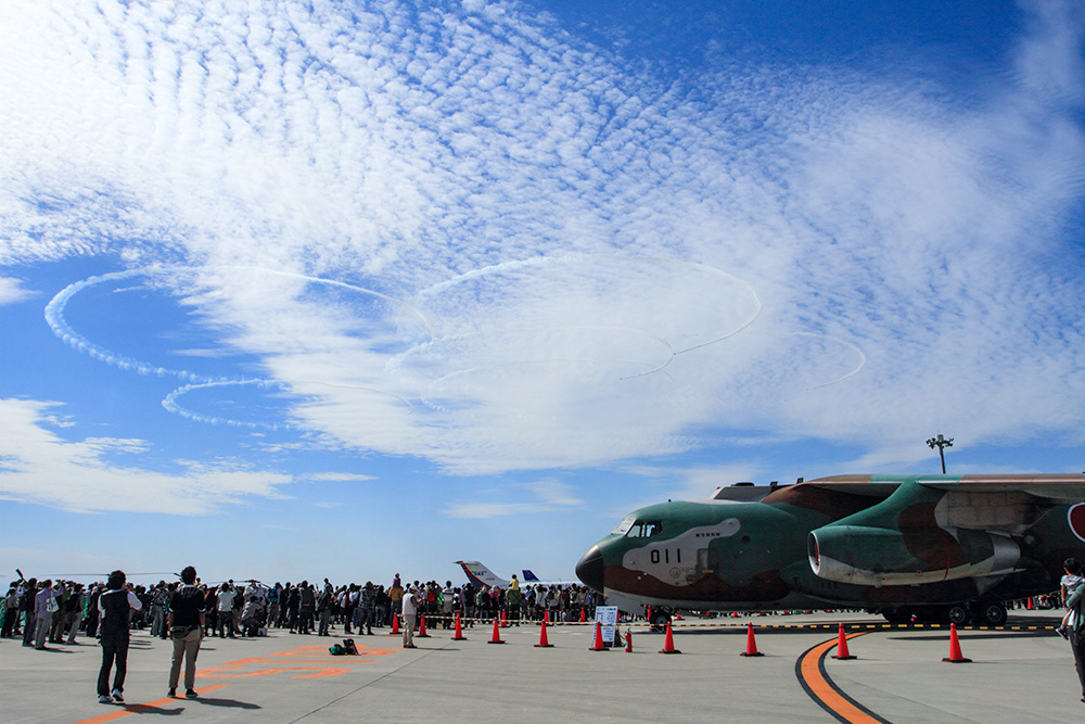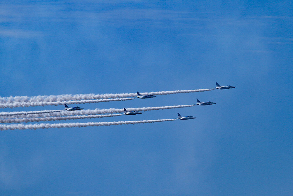 ![]() ブルーインパルスが、6つの輪”サクラ”を描いてくれましたが、雲が多くてきれいな絵になりませんでした。 |