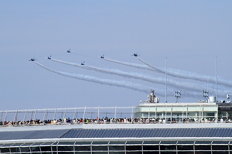 ブルーインパルスが入場してきたところです。 ターミナル屋上の展望台は、人がいっぱいです。 |