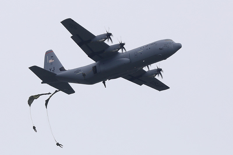 | 先ほど離陸したC-130Jから空挺降下のデモです。 |